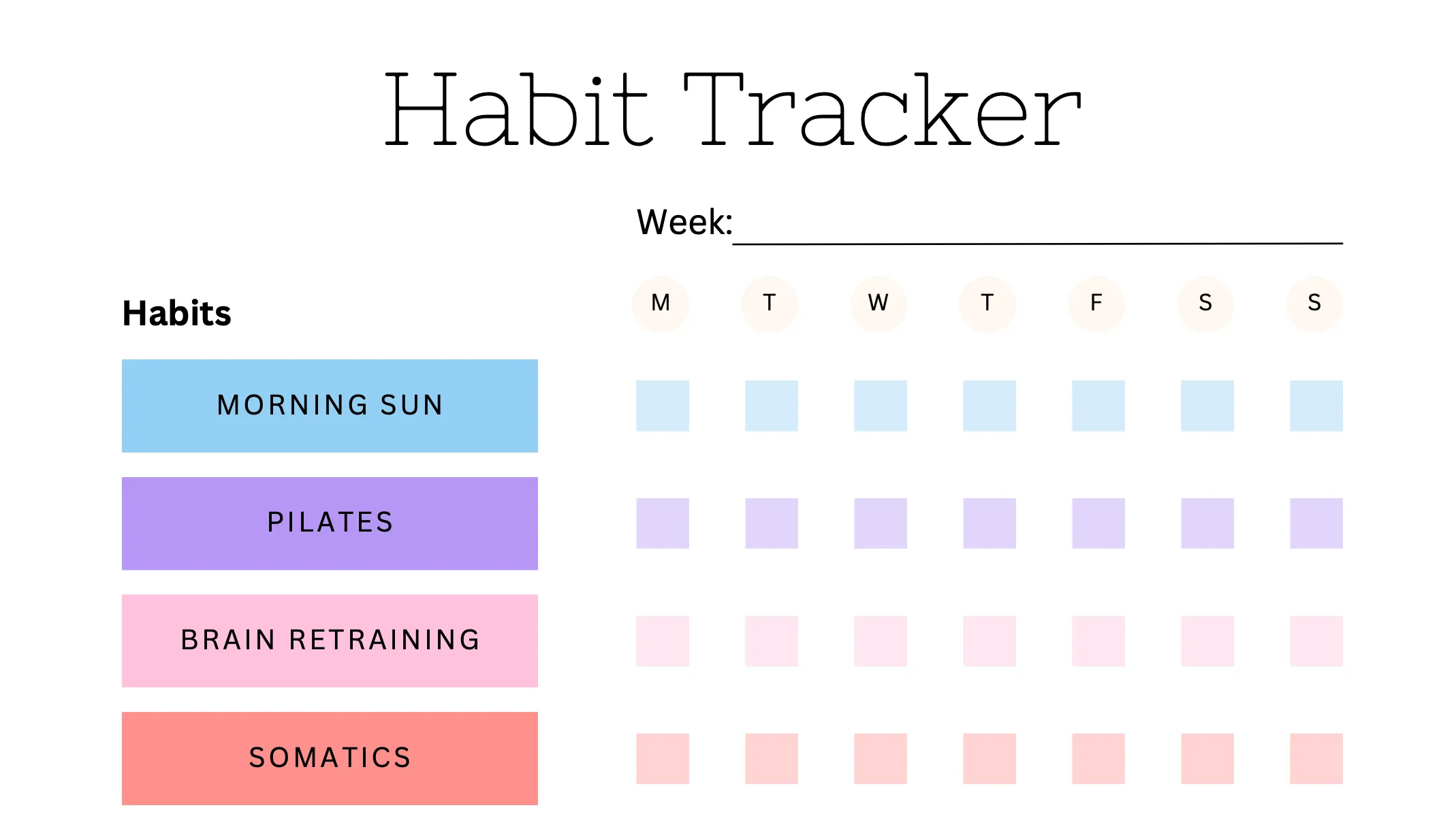 A blank habit tracker for you to organize your healing routines, and an example of one that I actually used during my recovery, when I was in the "expansion" phase. At the end of the week take a moment to reflect and celebrate your wins!